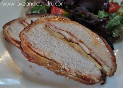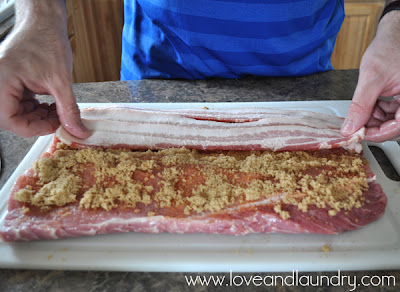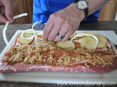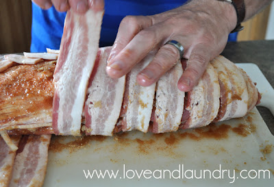 He makes this really delicious bacon wrapped smoked pork stuffed with apples and onions. And it’s my favorite thing in the world! It’s like Christmas for me every time he volunteers to make it! Usually he gets in ready in the middle of the night while I’m sleeping so I can’t take pictures. But, this time he did it in the middle of the day!