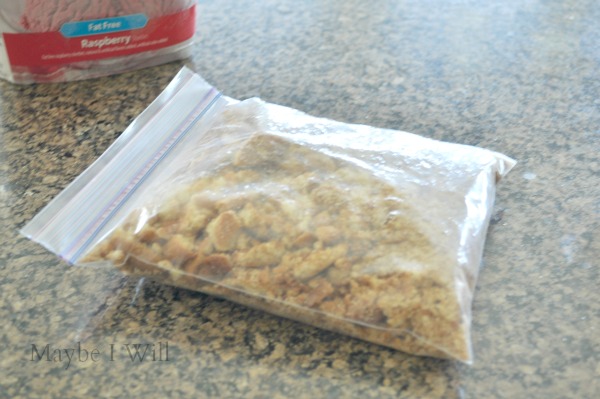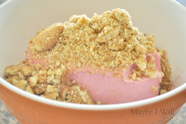 Just take your sherbet out and let it soften. Place macaroons in bag to crush them and stir them in with the sherbet. Then place in a 9×13 pan and refreeze!! No baking it’s that easy peeps!